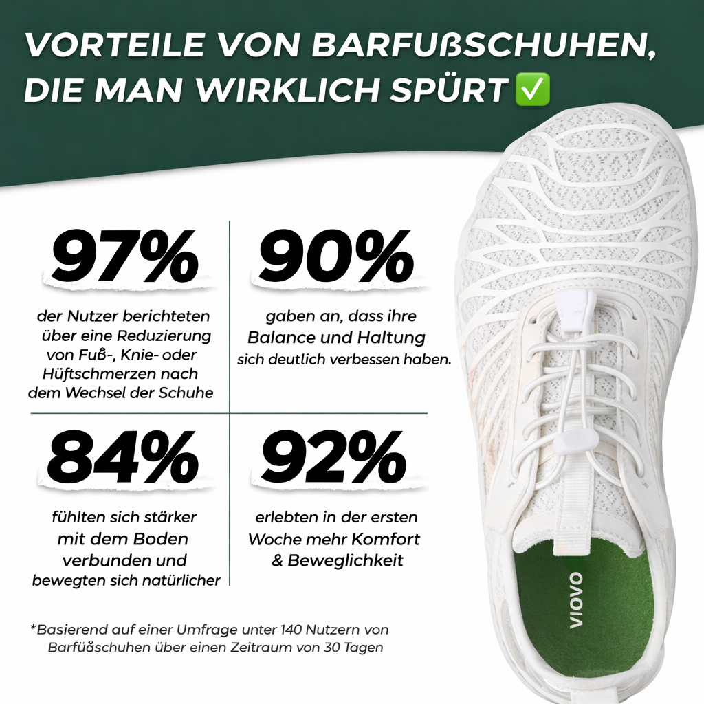 *Kürzlich hat uns eine Umfrage unter 400 Kundinnen und Kunden wertvolle Einblicke in ihre Erfahrungen gegeben. Nach 60 Tagen des Tragens der Barfußschuhe von Rootstep verbesserte sich die Fußgesundheit deutlich – dank der breiten Zehenbox, die den Füßen natürliche Spreizung ermöglicht, und des Zero-Drop-Winkels, der den Druck gleichmäßig zwischen Ferse, Fußgewölbe und Zehen verteilt.